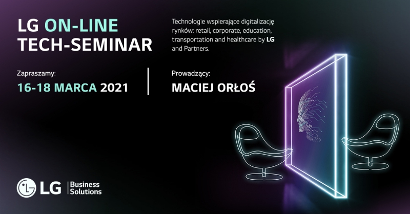 LG zaprasza na trzydniowe seminarium LG ON-LINE TECH-SEMINAR, które odbędzie się w dniach 16-18 marca b.r. i poświęcone będzie najnowszym technologiom wspierającym digitalizację rynków wertykalnych, takich jak Retail, Corporate, Education, Public, Healthcare, Hospitality i Transportation. Wydarzenie poprowadzi dziennikarz – Maciej Orłoś.