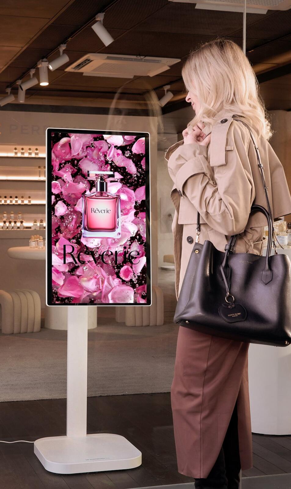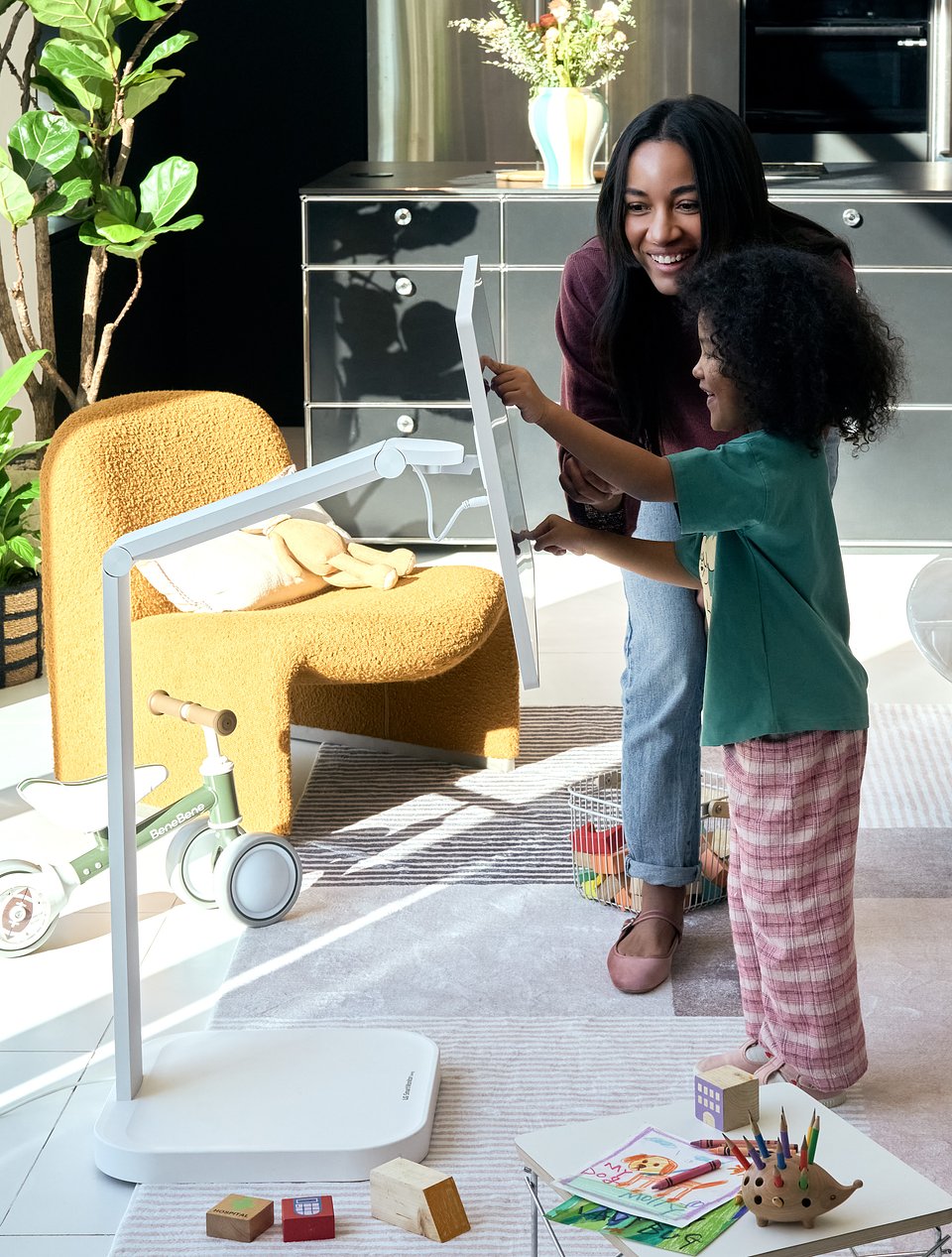 Model wyposażono dodatkowo w praktyczne kółka, które w połączeniu z szerokim zakresem regulacji dają pełną swobodę ustawienia – w dowolnym miejscu i pod dowolnym kątem. Zasilacz i przewody można dyskretnie ukryć w podstawie urządzenia, co zapewnia minimalistyczny i uporządkowany wygląd.