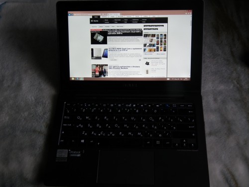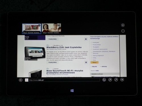 W tym trybie oprócz dużego ekranu, od razu rzuca się w oczy przycisk dotykowy Windows 8, który pozwala przejść do ekranu Start, lub do ostatnio otwieranej aplikacji. Ponadto mamy tutaj mikrofon do prowadzenia wideokonferencji, czujnik światła otoczenia i kamerę.