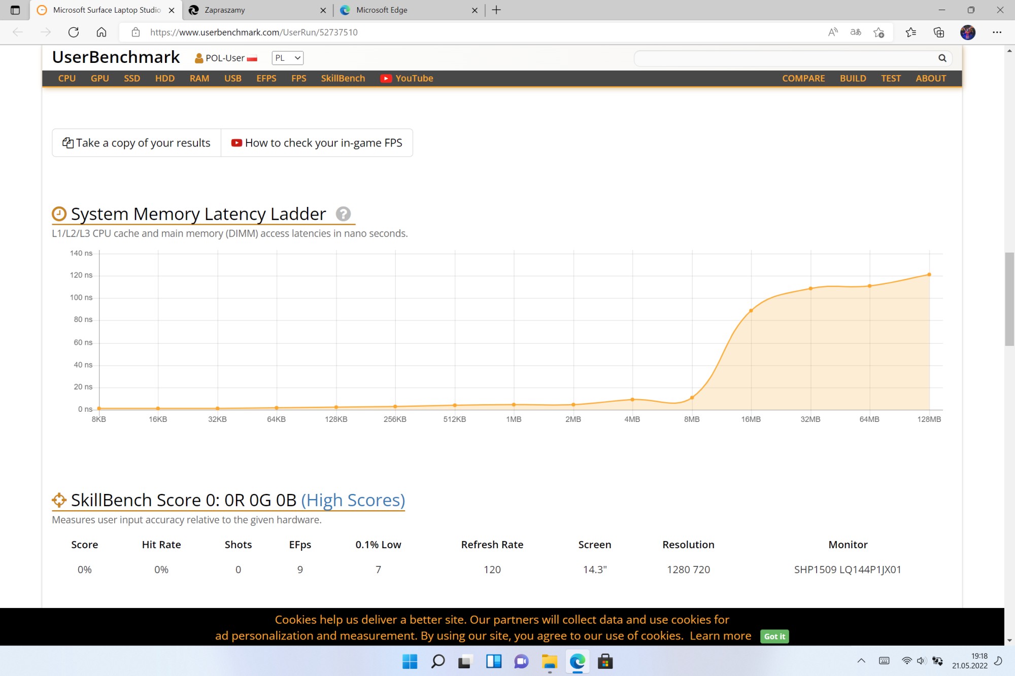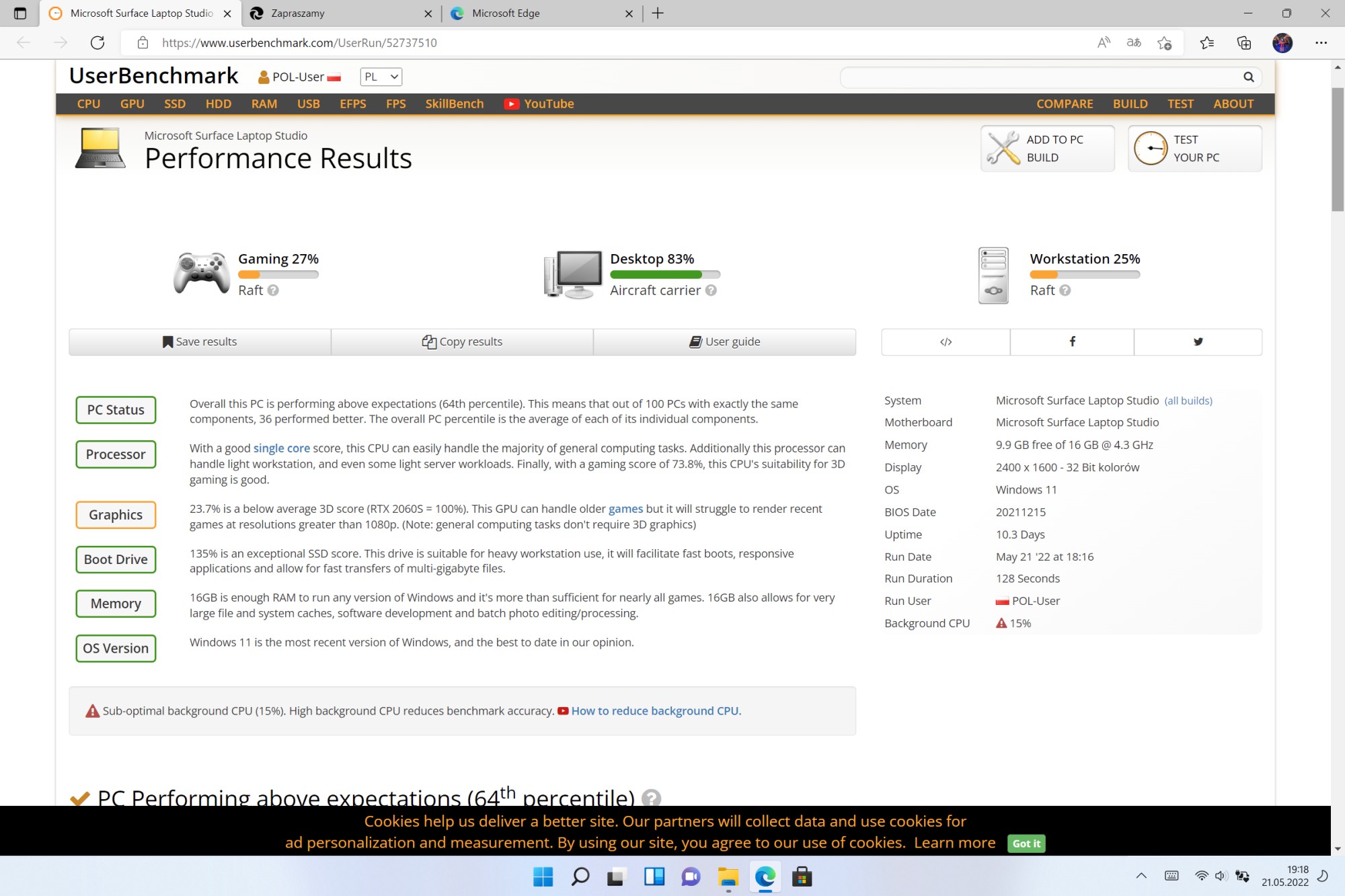Microsoft Surface Laptop Studio posiada świetny dotykowy wyświetlacz PixelSense™ Flow o przekątnej 14,4”, rozdzielczości 2400 x 1600 (201 PPI), współczynniku kontrastu 1500:1 oraz współczynniku proporcji: 3:2. Co więcej otrzymał on również odświeżanie 120 Hz oraz obsługę Obsługa Dolby Vision. Co tu będę dużo pisać. Po raz kolejny (jak przy większości Surface) muszę przyznać, że praca na takim ekranie, to czysta przyjemność. Poza momentami, gdy znajdziemy się na dworze. Niestety błyszcząca matryca sprawia, że widzimy w niej całe otoczenie, a mniej to co znajduje się na ekranie. Pomijając tą niedogodność, to w warunkach biurowych, a nie polowych, możemy liczyć na bardzo czytelny i pełny szczegółów ze świetnie odwzorowanymi kolorami obraz. Komfortowo można na nim pracować z wszelkiego rodzaju dokumentami, oglądać filmy czy przeglądać ulubione strony WWW. Dużą zaletą jest też wspomniana możliwość odchylenia ekranu czy obrócenia i położenia wręcz na płasko. Szczególnie, że mamy tutaj do czynienia z dotykową matrycą i dużo wygodniej jest poruszać się po niej w poziomie czy pod ukosem niż w pionie.