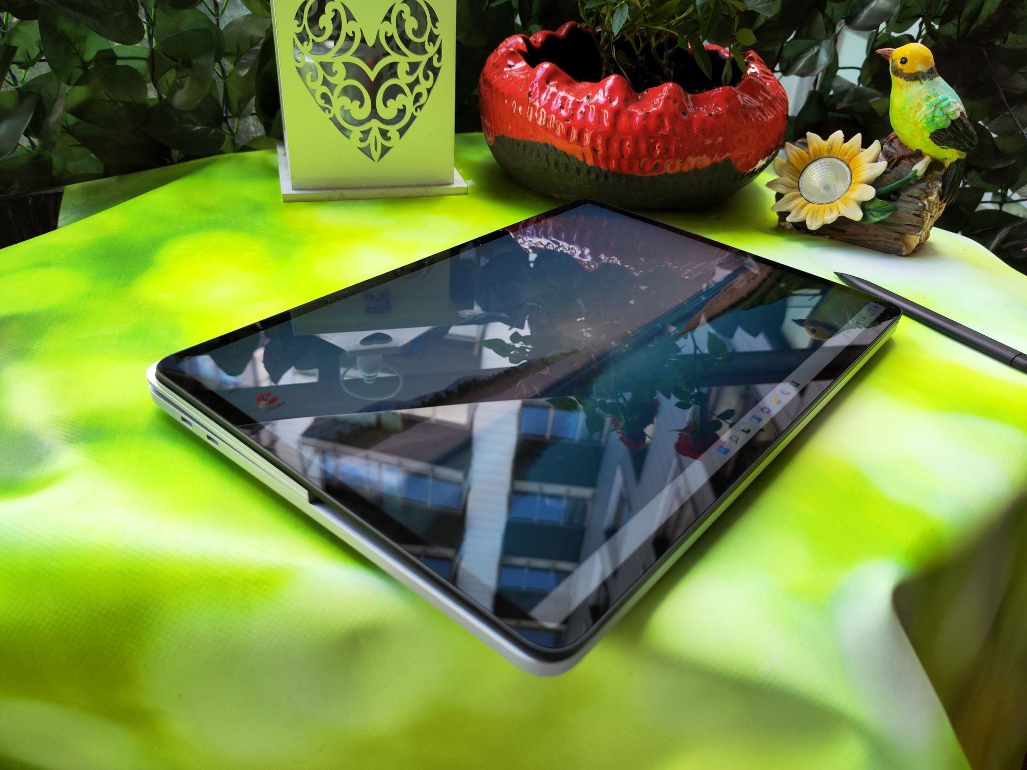 Cały mechanizm działa bardzo płynnie i bez problemu pozwala na stabilne ustawienie ekranu w kilku wspomnianych pozycjach. Dobrze pracuje się na nim w każdej z nich. Osobiście bardzo polubiłam wersję z lekko odchylonym ekranem, gdy bawiłam się rysikiem (możemy zakupić go osobno). Jedyna niedogodność jest taka, że tracimy wtedy dostęp do klawiatury i zostaje nam użycie wirtualnej na ekranie lub zewnętrznej. Takie ułożenie też świetnie sprawdza się podczas spotkań biznesowych, gdy nie mamy dostępu do ekranu zewnętrznego. Przy wyświetlaniu slajdów sprawdził się rewelacyjnie.
