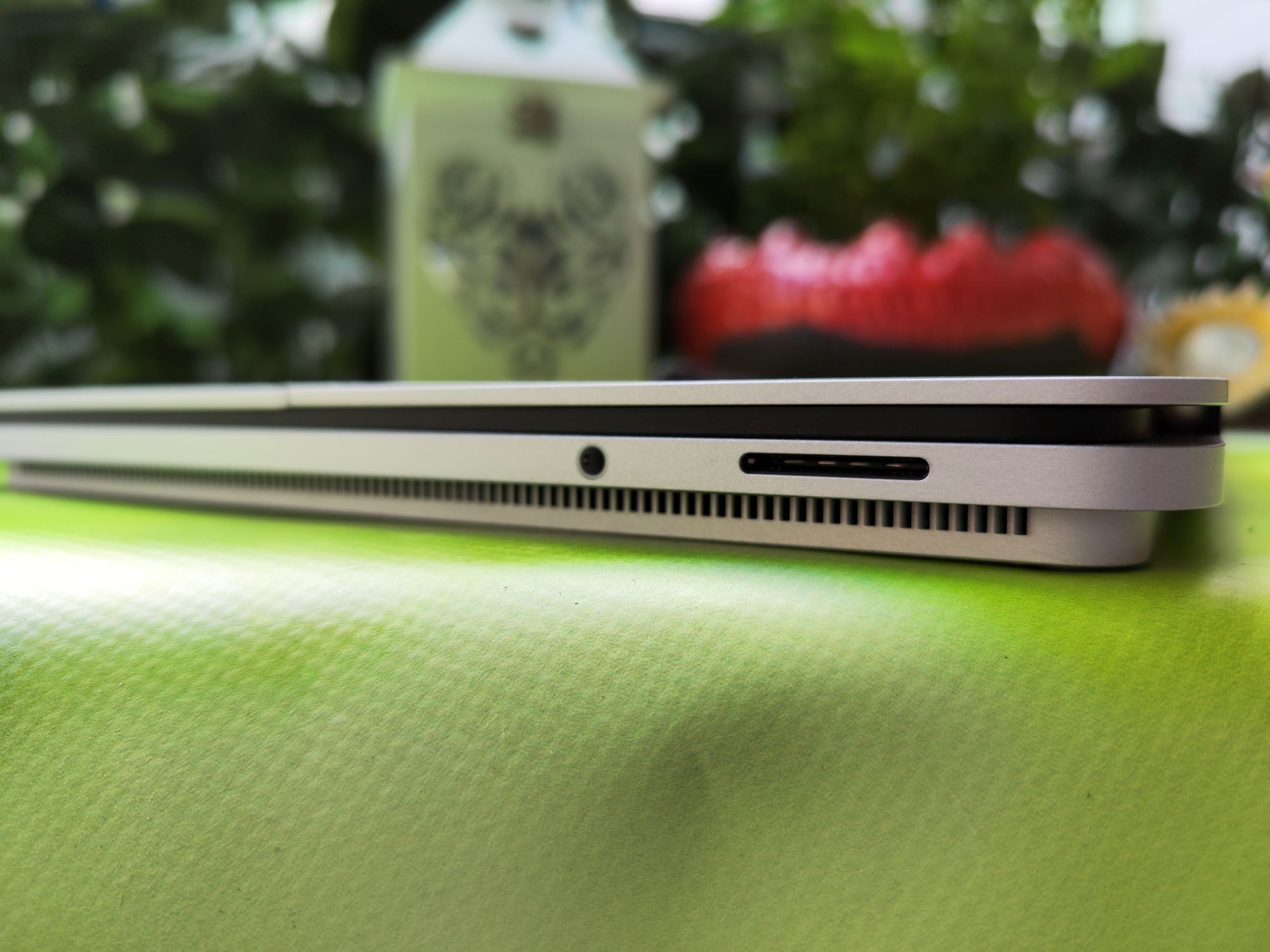 Można powiedzieć, że jest wszystko to, co przydaje się podczas codziennej pracy w biurze i poza nim. Niestety taka minimalna konstrukcja bardzo ograniczyła też ilość portów. Znajdziemy tutaj zaledwie 2 porty USB-C na lewej krawędzi i wyjście Mini Jack oraz gniazdo do ładowania akumulatora na prawej krawędzi. I to wszystko. Osobiście zabrakło mi w nim chociaż jednego wyjścia USB A czy HDMI. Ciągle jeszcze jestem przyzwyczajona do myszki z kabelkiem, a i czasami przychodzi potrzeba podłączenia innych urządzeń zewnętrznych np. dysk. I tu zaczął się kłopot. Zatem niestety nie obejdziemy się bez przejściówki jeżeli będziemy chcieli podłączyć niektóre urządzenia. Cóż piękno i minimalizm idzie w parze z pewnymi wyrzeczeniami i dodatkowym miejscem w plecaku na potrzebne przejściówki.