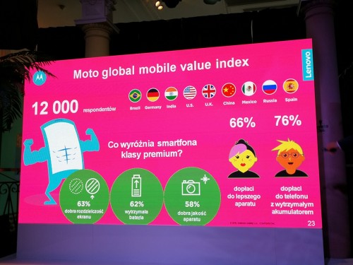 Każdy używa smartfona na swój własny sposób, ale istnieje kilka rzeczy, które są uniwersalne dla wszystkich. Motorola w badaniu Global mobile Value Index1 dowiodła, że każda osoba na świecie pragnie smartfonów z półki premium. 63% ankietowanych ceni sobie rozdzielczość i jakość ekranu, 62% długi czas pracy na baterii, a 58% dobry aparat. Nowe Moto G posiadają cechy charakterystyczne dla produktów premium i to bez pójścia na kompromis w kwestii designu, wydajności, a przede wszystkim ceny. 76% osób jest w stanie zapłacić więcej za mocniejszą baterię, a 66 za jeszcze lepszy aparat. Na szczęście nie muszą tego robić, bo wszystko to jest dostępne w smartfonach Moto G piątej generacji