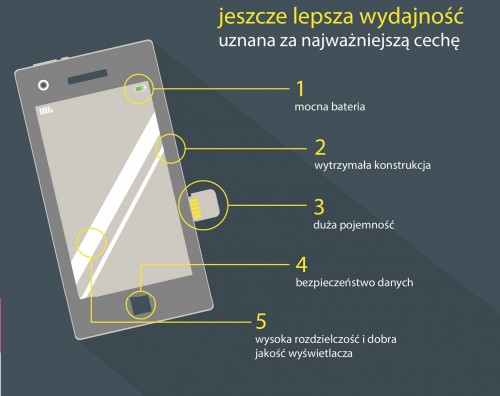 Najbardziej pożądanymi cechami z półki premium, jakie użytkownicy chcieliby znaleźć w swoim nowym telefonie jest jeszcze mocniejsza bateria, lepszy aparat oraz doskonała jakość i wysoka rozdzielczość ekranu.