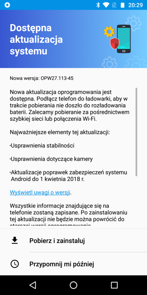 • Akcje Moto: szybkie zdjęcie ekranu; nawigacja jednym przyciskiem; dwukrotne potrząśnięcie nadgarstkiem, aby włączyć latarkę; przesunięcie palcem, aby zmniejszyć ekran; podniesienie telefonu, aby przestał dzwonić; położenie telefonu ekranem w dół, aby go wyciszyć