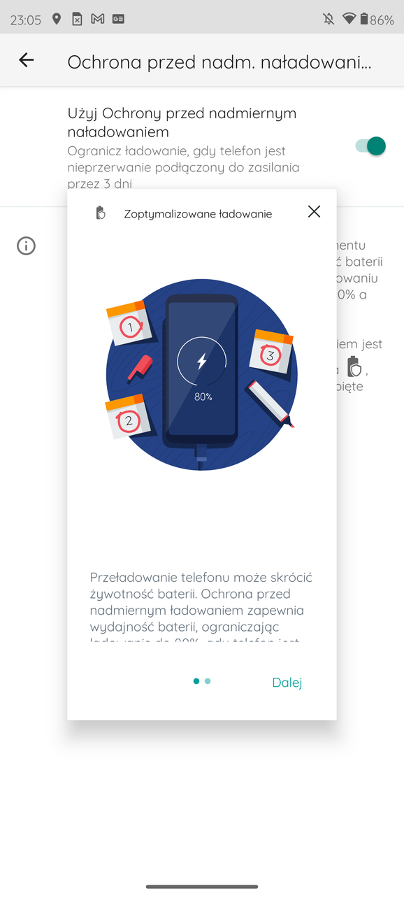 Obraz wyświetlany na tym ekranie jest świetny. Wszystko jest wyraźne, kolory nasycone, kąty widzenia szerokie, a odświeżanie ekranu jedno z wyższych aktualnie na rynku. Można bez problemu pracować na nim nawet w słoneczne dni. Raczej ciężko się tutaj do czegokolwiek przyczepić. Ponadto w opcjach znajdziemy kilka możliwości konfiguracyjnych: zmiana na ciemny motyw, zmiana kolorów (nasycone, naturalne, regulacja temperatury kolorów), zmiana odświeżania (60 Hz, 144 Hz, automatyczny), personalizacja kolorów, czcionek czy ikon, podświetlenie nocne, zapobieganie migotaniu obrazu czy zmiana poziomu jasności oraz możliwość włączenia opcji „uważny ekran” (ekran jest włączony, gdy na niego patrzymy). Zatem każdy znajdzie coś dla siebie. Standardowo też mamy do dyspozycji moto gesty oraz nawigację gestami lub możliwość włączenia standardowej belki z przyciskami. Tą ostatnią, to bardzo szybko wyłączam, gdyż gesty są mega wygodne w nawigacji. Jednak to kwestia gustu i dobrze, że są obie możliwości.