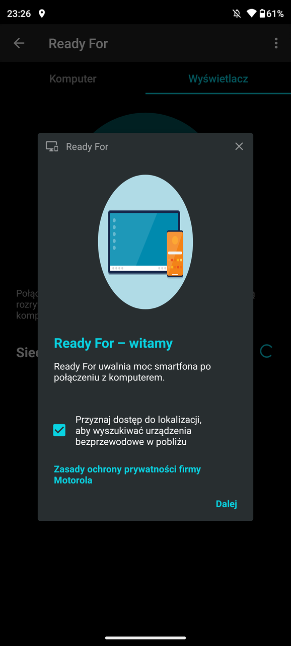 Najciekawszą funkcją jest jednak platforma Motoroli Ready For, która pierwszy raz została zaprezentowana w modelu moto g100. Pozwala ona na połączenie telefonu z telewizorem czy monitorem i rozszerzenie miejsca roboczego o dodatkowy pulpit. Dotychczas do podłączenia był potrzeby adapter MHL (HDMI – USB C), a od rodziny edge 20 wystarczy już połączenie Wi-Fi (na komputerze z Windows 10 wystarczy tylko zainstalować aplikację Ready For PC).