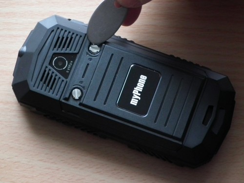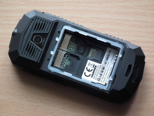 Po odkręceniu dwóch dużych śrub, za pomocą przydatnego narzędzia – metalowej płytki, którą otrzymujemy w zestawie i zdjęciu pokrywy, mamy dostęp do dwóch wyjmowanego akumulatora, dwóch gniazd SIM i gniazda na m karty pamięci microSD.