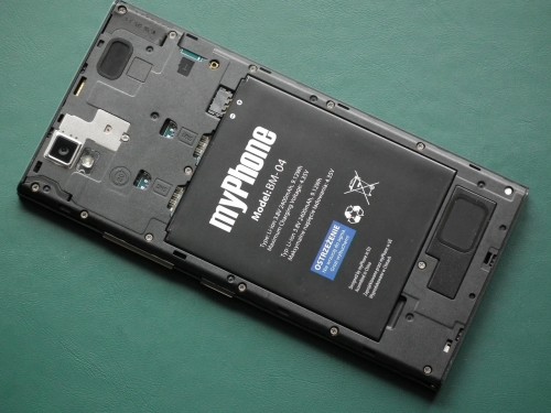 Pod tylną klapką, oczom naszym ukaże się wymienny akumulator, dwa sloty na karty SIM – oba w rozmiarze micro, gniazdo na kartę pamięci microSD.
