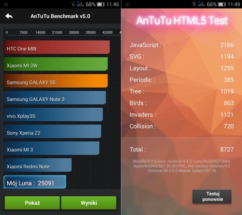 I to było to! Przez te kilka dni, które go posiadam mogłem już się trochę zapoznać z tym sprzętem. Mam również możliwość porównania go z modelami innych firm np. Galaxy S5, S3 itp. I muszę przyznać, że wypada naprawdę nieźle. Jeśli chodzi o ekran to S3 wymięka. Dużo bliżej mu do Galaxy S5. Luna ma co prawda ma rozdzielczość HD, ale w normalnym użytkowaniu nie widać pojedynczych pikseli, a z lupką nie będę chodził ;). Testowałem telefon również instalując grę Real Racing 3 i muszę przyznać, że jest naprawdę nieźle. Zdarzały się małe przycięcia, ale w telefonie Samsung Galaxy S5 były one również. Sam aparat nie jest zły. Moim zdaniem jest trochę lepiej niż w telefonie Galaxy S3. Sam system to prawie czysty android. Nie ma tyle fajerwerków co Samsungi, ale jest nieźle. Ma nawet funkcję podobną do knock on stosowaną w telefonach LG. Można „wybudzić” ekran stukając dwukrotnie w ekran. Można też gestem uruchomić aparat pomijając blokadę. To bardzo przydatna funkcja. Telefon wizualnie jest naprawdę efektowny i przyciąga wzrok innych. Ma on swoje gabaryty, ale dla mnie to nie problem, gdyż noszę go w saszetce typu „nerka”. Można by tu jeszcze pisać. Dźwięk jest jakościowa na wysokim poziomie. Nawigacja również działa bez zarzutu. Jestem bardzo zadowolony i nie sądzę bym w tej cenie dostał coś lepszego.