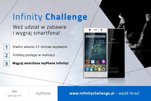 „Chcesz coś zmienić lub czegoś się nauczyć, ale brakuje Ci motywacji? Weź udział w konkursie Infinity Challenge. Wyznacz sobie cel, który będziesz konsekwentnie realizować przez 21 dni, poproś o wsparcie znajomych i wygraj najnowszy smartfon myPhone INFINITY.” – tak głosi oficjalne wezwanie do udziału w konkursie, zorganizowanym w ramach kampanii reklamowej nowej serii smartfonów premium – myPhone INFINITY.