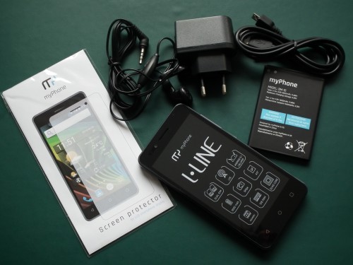 Standardowo już dla myPhone w pudełku znajdziemy telefon komórkowy myPhone L-Line, akumulator o pojemności 3000 mAh i ładowarkę sieciową (adapter + przewód USB) oraz dokumentację. Ponadto producent dorzucił przeciętne słuchawki douszne wyposażone w pilota i folię ochronną na wyświetlacz. Zestaw bogadty, jak na niedrogi smartfon.