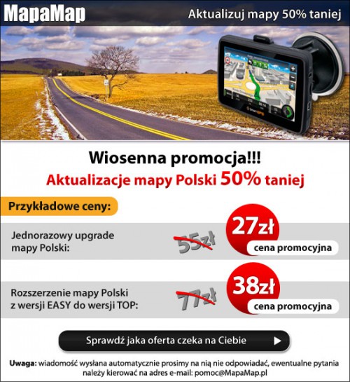 W ramach promocji „Wiosenna promocja MapyMap” mapy Polski do nawigacji MapaMap producent oferuje 50% taniej.