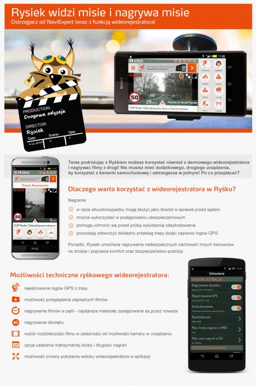 Popularność kamer samochodowych, wykorzystywanych przez kierowców jako czarne skrzynki, rośnie z miesiąca na miesiąc. Wychodząc naprzeciw oczekiwaniom kierowców producent ostrzegacza na telefony Rysiek wdrożył właśnie do swojej aplikacji funkcję wideorejestratora. Od teraz podróżując z Ryśkiem jego użytkownicy mogą nagrywać filmy z drogi bez konieczności posiadania dodatkowego, drogiego urządzenia.