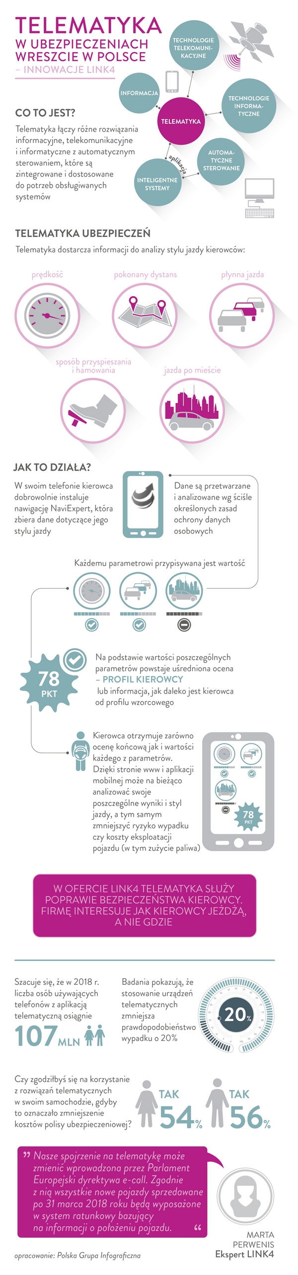 Czy styl jazdy kierowcy będzie wykorzystywany przez ubezpieczyciela do obliczania składki? Nie. W przypadku klientów indywidualnych LINK4 nie planuje wykorzystywać danych o stylu jazdy do kalkulowania składek. Chcemy natomiast takie rozwiązania zastosować w drugiej połowie roku w polisach dla flot samochodowych – wyjaśnia Marta Perwenis, Dyrektor Departamentu E-Business w LINK4.
