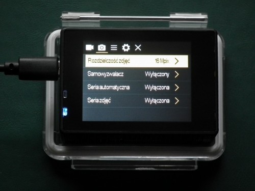 Na obudowie, oprócz przydatnej faktury, uniemożliwiającej wyślizgnięcie się tego maleństwa z rąk, znajdziemy również 2-calowy, kolorowy wyświetlacz LCD, przyciski włączania kamery, uruchamianie funkcji Wi-Fi, oraz przyciski umożliwiające przechodzenie po menu.