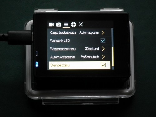 - Ustawienia: jak w oznaczeniu, możemy tutaj dostosować kamerkę do naszych potrzeb. Z ciekawszych ustawień mamy tutaj funkcję „Odwrócony obraz”, która zgodnie z jej nazwą, odwraca obraz z oka kamery. Jest to przydatne, gdy jedyną możliwością skorzystania z kamery jest ustawienie jej w pozycji „do góry nogami”. Przydatna dla kierówców jest także funkcja „Tryb rejestratora”. Zaznaczenie tej opcji spowoduje, iż urządzenie będzie uruchamiać się automatycznie po podaniu zasilania (przy podłączonej ładowarce samochodowej – po włączeniu silnika) oraz automatycznie rozpoczynać nagrywanie.