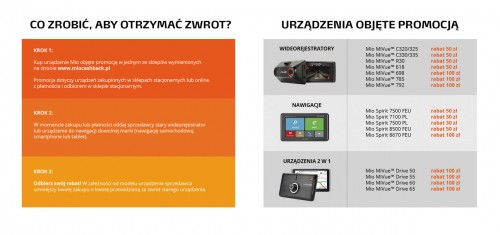 Akcja obejmuje wybrane sklepy, których lista znajduje się na stronie www.miocashback.pl. Aby odebrać swój rabat, w momencie zakupu wystarczy oddać sprzedawcy w ramach rozliczenia stary wideorejestrator lub urządzenie do nawigacji dowolnej marki (np. nawigację samochodową, smartphone lub tablet), działające lub nie. W zależności od modelu, kwota zakupu zostanie pomniejszona o kwotę za zwrot starego urządzenia.