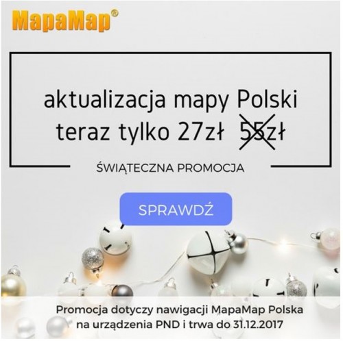 W ramach Świątecznej Promocji cena jednorazowej aktualizacji mapy Polski do nawigacji PND z systemem MapaMap Polska jest 50% niższa i wynosi tylko 27 zł (cena regularna 55 zł).