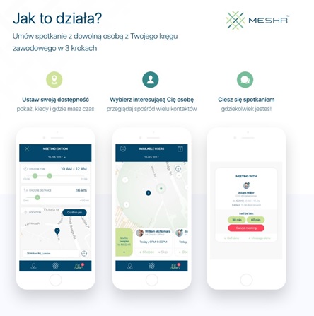 Warunkiem dostępu do MESHR jest posiadanie aktywnego konta na Linkedinie, z którym aplikacja jest zintegrowana. Dalej można umówić spotkanie w trzech prostych krokach: