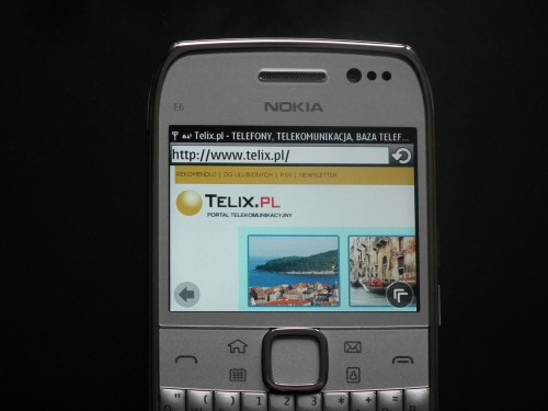 Nokia E6 oferuje dotykowy wyświetlacz, który został wykonany w technologii pojemnościowej z multi-touch, i o ile znakomicie reaguje na dotyk, to moim zdaniem używa się go tylko okazjonalnie. Powód na ekranie o przekątnej 2,46” literki są zdecydowanie za małe, a i w przypadku przeglądania Internetu ciągle jesteśmy zmuszani na powiększanie i przewijanie odwiedzanych stron. Nie jest to komfortowe przeglądanie zasobów sieci, aczkolwiek zazwyczaj wystarczy, by szybko przeglądnąć pocztę, czy sprawdzić potrzebne informacje. Standardowa dla Nokii przeglądarka internetowa nie ma problemów z wyświetleniem większości stron. Niestety kilkakrotnie zauważyłem dziwne zachowanie się telefonu podczas trwania sesji internetowej – warto na to zwrócić uwagę, gdy używamy go podczas połączenia GPRS – może nam generować dodatkowych kosztów. Otwierając stronę, miast płynnie ją otworzyć zaczynał ją ciągle odświeżać, a do tego lubi zacinać się przy próbie przesuwania fragmentów stron. Prawdopodobnie było to wynikiem wyskakujących okienek z reklamami, można to wyłączyć w ustawieniach. Telefon posiada Flash Player 4 Lite, „odchudzoną” wersję Adobe Flash Player zoptymalizowaną dla telefonów komórkowych i innych urządzeń przenośnych, przez co nie wszystkie strony z Flashem poprawnie się otwierają. Dodam, że telefon posiada moduł GSM/3G. Szybkość transmisji danych może wynosić 10,2 Mb/s (HSDPA). Nie zabrakło także modułu WLAN, który zapewnia połączenia z sieciami Wi-Fi w standardzie 802.11 b/g/n.