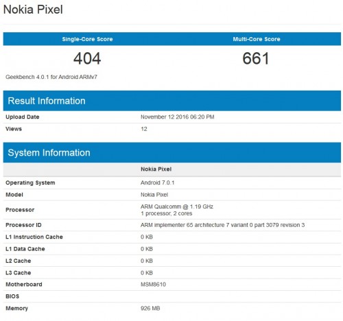 Na liście GeekBench widnieje nazwa Nokia Pixel, jednak to prawdopodobnie tylko nazwa kodowa, a finalnie smartfon będzie nosił inne miano. Specyfikacja jasno ukazuje, że mamy do czynienia z absolutnie niskobudżetowym urządzeniem – mówimy bowiem o procesorze Snapdragon 200 (2 x 1,19 GHz) i 1 GB RAM-u. Pomimo tak słabych podzespołów, zdecydowano się na użycie Androida w wersji 7.0.1, choć dzięki dobrej optymalizacji sprzęt ten powinien sobie bez problemu z nim poradzić. Miłym akcentem jest obecność technologii szybkiego ładowania Quick Charge 3.0.