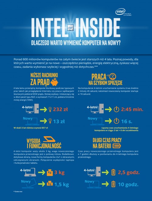Według globalnych badań Intela, użytkownicy na całym świecie korzystają obecnie z ponad 600 milionów komputerów, które zostały kupione 4 lata temu lub wcześniej. Z urządzeń starszej generacji korzysta również wiele polskich firm, ponosząc tym samym znaczne koszty bezpośrednie i pośrednie – od wysokich rachunków za energię po marnowanie czasu pracowników, spowodowane długim uruchamianiem urządzeń oraz przetwarzaniem zadań.
