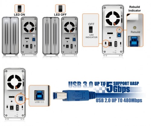 Diody LED pokażą kiedy dysk został wysunięty, pracuje lub się uszkodził. Kiedy urządzenie jest w trakcie przebudowy w trybie matrycy RAID 0, z tyłu zaświeci się dioda. ICYRaid MB662U3-2S R1 zawiera oprogramowanie pozwalające sterować diodami LED. To rozwiązanie jest idealne dla osób mających urządzenie w pokoju i nie chcą świecących diod w nocy; wyłącznik znajduje się na tylnym panelu obudowy. Dodatkowo, oprogramowanie monitorujące pozwala w łatwy sposób zarządzać matrycami RAID, zarówna na Windowsie jak i urządzeniach z MacOS
