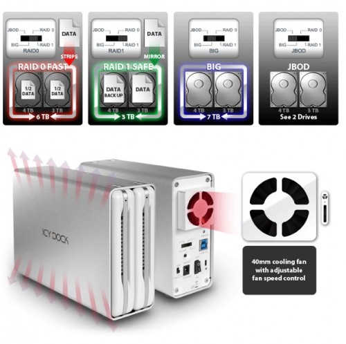ICYRaid MB662U3-2S R1 jest podwójną zatoką, w które można zamontować dwa dyski HDD w macierzy RAID, które są niezależne wobec komputera. Oznacza to, że nie obciąża ona zasobów komputera i można ją podpiąć do dowolnego systemu poprzez port USB. MB662U3-2S R1 pozwala swobodnie wybierać pomiędzy różnymi macierzami: RAID 0 (FAST-wydajny), RAID 1(SAFE-bezpieczne), BIG i JBOD.