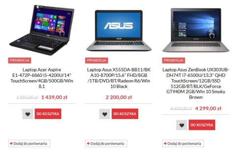 Na liście przecenionych laptopów znalazły się także produkty Acera oraz Asusa. Asus Zenbook UX303 można obecnie kupić za 4299 złotych, oszczędzając tym samym 351 PLN. Pod kątem specyfikacji tego modelu warto zwrócić uwagę na dysk SSD o pojemności aż 512 GB oraz dotykowy ekran o przekątnej 13,3 cala.