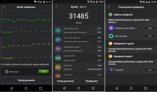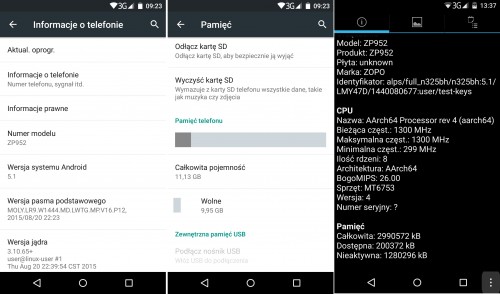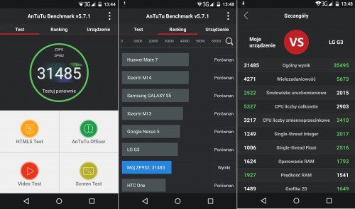Taka specyfikacja wystarczy, aby telefon poradził sobie z każdą aplikacją, a w testach wydajności dotrzymywał kroku dużo droższej konkurencji. Obiektywna ocena wyników benchmarków jest trudna, bo nie jest jasne, na ile są one zasługą ośmiu rdzeni. Ale podzespoły dają radę nie tylko podczas codziennej obsługi systemu operacyjnego i interfejsu, gdzie reakcja na polecenia jest natychmiastowa, ale też na bezproblemowe uruchomienie większości tytułów dostępnych w Google Play. Jedynym minusem i to niestety dość sporym jest ilość ciepła jaką CPU emituje przy pełnym obciążeniu. Pamięć wewnętrzna, zarezerwowana na wszelkiego rodzaju dane i aplikacje wynosi 16 GB (dla użytkownika dostępne jest około 10 GB ) z możliwością rozszerzenia poprzez wykorzystanie slotu na karty microSD (obsługa do 64GB). Jeżeli wewnętrzna pamięć to dla Was zdecydowanie za mało, pamiętajcie, że przy wykorzystaniu wbudowanego slotu na karty microSD można ją rozbudować o maksymalnie 64 GB. Dla lubiących cyferki, Zopo Speed 7 Plus poddałem także testom wydajnościowym, które zostały wykonane najpopularniejszych aplikacjach benchmarkowych: AnTuTu i Quadrant. Wyniki przedstawiają się następująco: