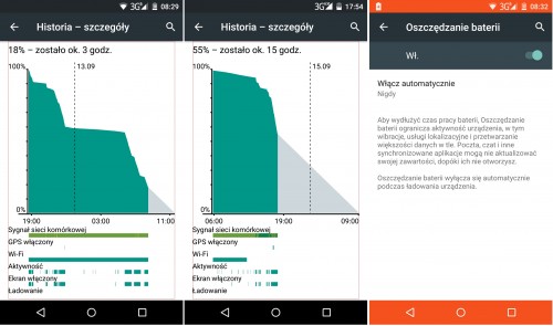 W trakcie intensywnej pracy ze smartfonem akumulator rozładuje się po upływie około 12 godzin. W trybie bardzo umiarkowanym, taka pojemność pozwala na działanie smartfona do 1,5 dnia. W trybie czuwania, z wyłączonym Wi-Fi smartfon pokazał nam ubytek energii ok. 5%., w czasie 8 godz. Czas ładowania akumulatora ok. 4,5 godz. W zarządzaniu energią pomaga dedykowany tryb jej oszczędzania, który znajdziemy w Ustawieniach. Tryb oszczędzania baterii ogranicza maksymalną wydajność procesora i pozwala przedłużyć do 2 dni czas pracy urządzenia.