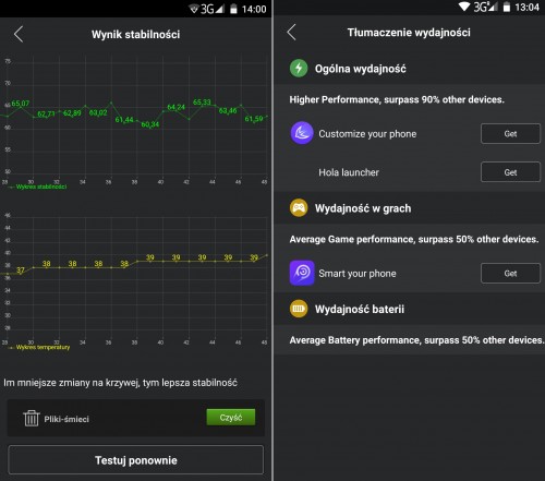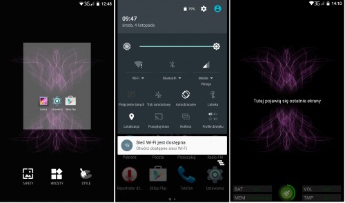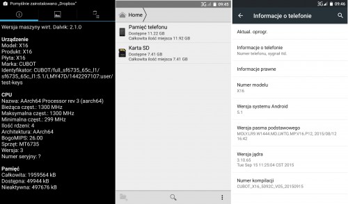 Po rozwinięciu notyfikacji do pełnego ekranu mamy skrót do Ustawień ważnych funkcji: aktywności Wi-Fi, Bluetooth, modułu GPS, przesyłu danych, wyciszenia itp. Efektowne Motywy producenta pozwalają na personalizację telefonu. Wszelkie przejścia pomiędzy ekranami są szybkie i bardzo płynne. Aplikacji, które dołączono do systemu nie ma zbyt wiele. I dobrze, bo większość programów i tak jest na ogół nie potrzebna. Naciskając dłużej klawisz „Dom” Cubot, daje nam możliwość podejrzenia aktualnych danych systemu takich jak m.in.: baterii, temperatury, pamięci, z możliwością jego konserwacji. Smartfon posiada wbudowany sklep Google Play, z którego za darmo pobierzecie niezbędne aplikacje i gry.