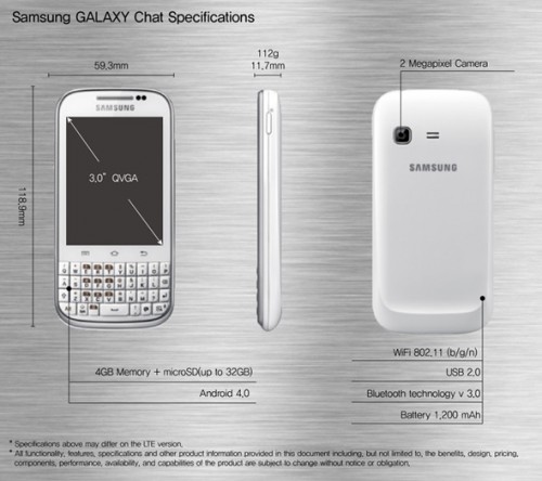 Samsung postanowił zaspokoić oczekiwania użytkowników, którzy szukają taniego telefonu z pełną fizyczną klawiaturą QWERTY. Smartfon zaoferuje także aplikacje Game Hub oraz wsparcie do multimedialnego centrum rozrywki AllShare Play. Zasilanie ma zapewniać bateria o pojemności 1200 mAh.