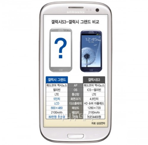 Samsung ma tym razem propozycję dla tych, którzy uważają że 5.5-calowy wyświetlacz Galaxy Note II jest zbyt duży, a Galaxy S III za mały. Samsung Galaxy Grand oferuje 5-calowy wyświetlacz o rozdzielczości 800×480 pikseli. Telefon korzysta z czterordzeniowego procesora Exynox 4412, który jest taktowany zegarem o częstotliwości 1,4 GHz.