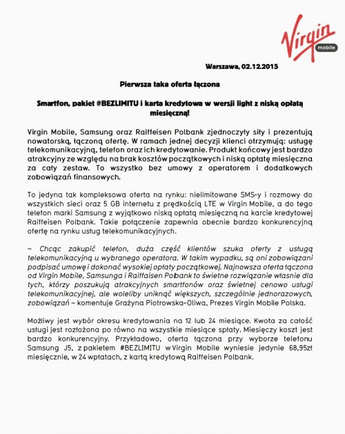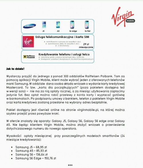Virgin Mobile, Samsung oraz Raiffeisen Polbank zjednoczyły siły i prezentują nowatorską, łączoną ofertę. W ramach jednej decyzji klienci otrzymują: usługę telekomunikacyjną, telefon oraz ich kredytowanie.