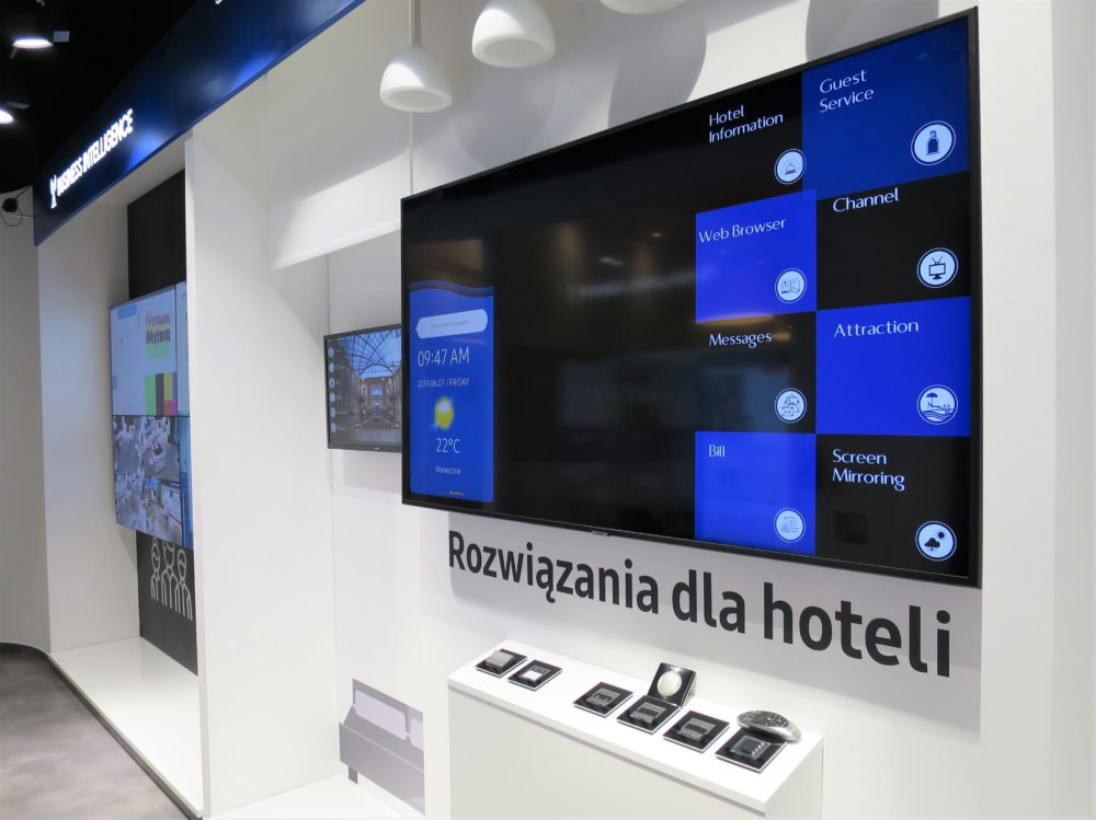 W Showroomie osobiście można sprawdzić jak działają najnowsze systemy HMS do zarządzania urządzeniami w pokoju hotelowym takimi jak rolety, oświetlenie czy klimatyzacja z poziomu SMART TV. Uczestnicy poznali nowości w obszarze urządzeń do prezentacji i prowadzenia spotkań, takich jak Samsung Flip.