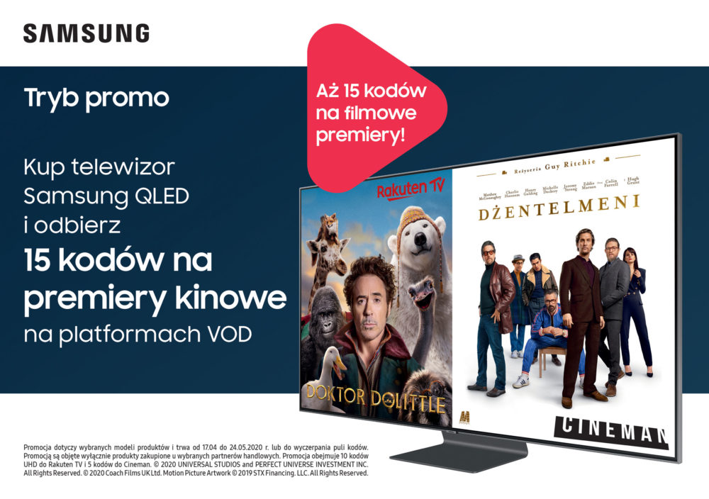 - Kupując w ramach promocji „Filmowe wieczory z Samsung” wybrane modele telewizorów QLED, widzowie będą mogli zyskać dostęp do premierowych treści oferowanych przez popularne platformy VOD.