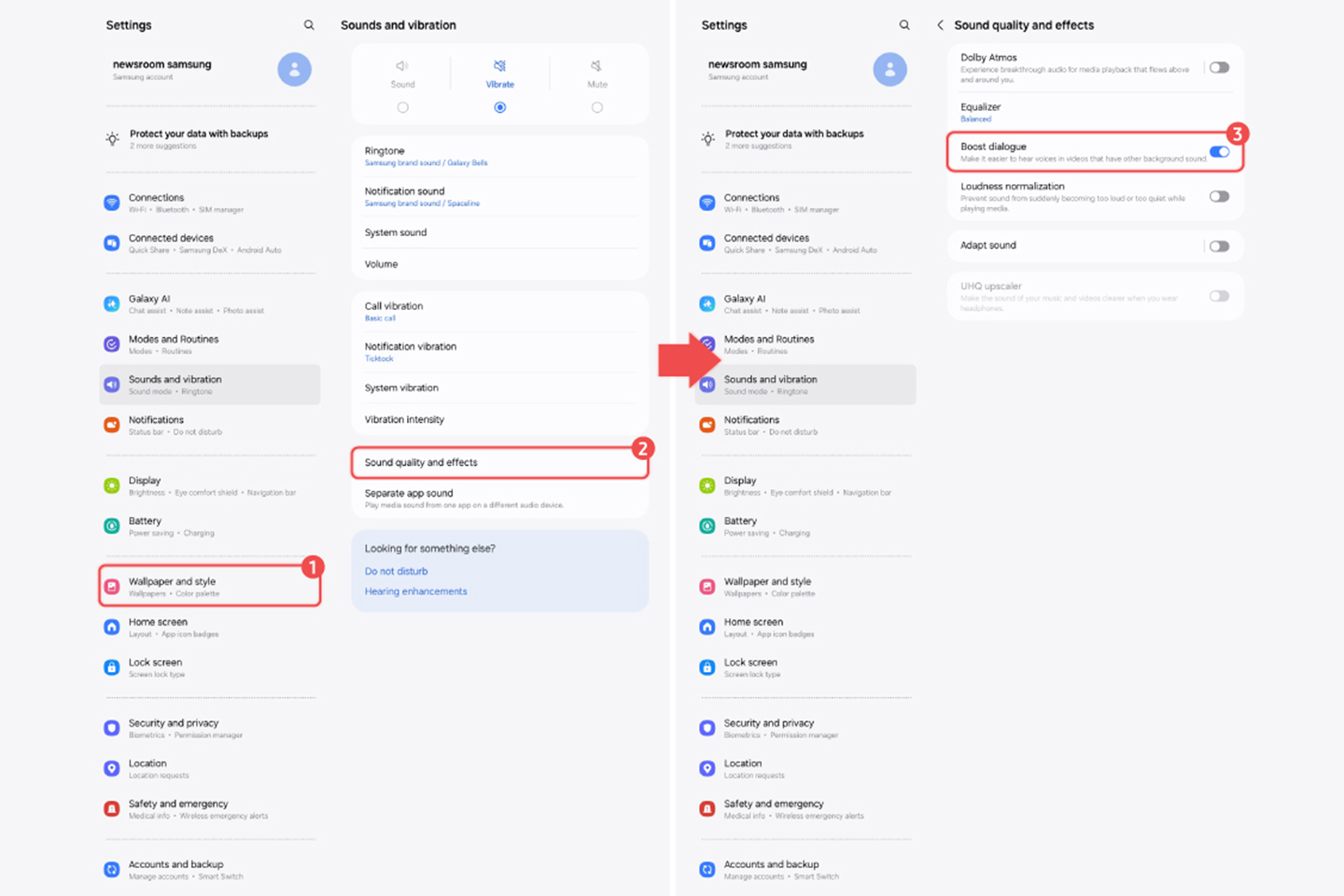 Przejdź do menu Jakość dźwięku i efekty w Ustawieniach i wybierz Wzmocnienie dialogów