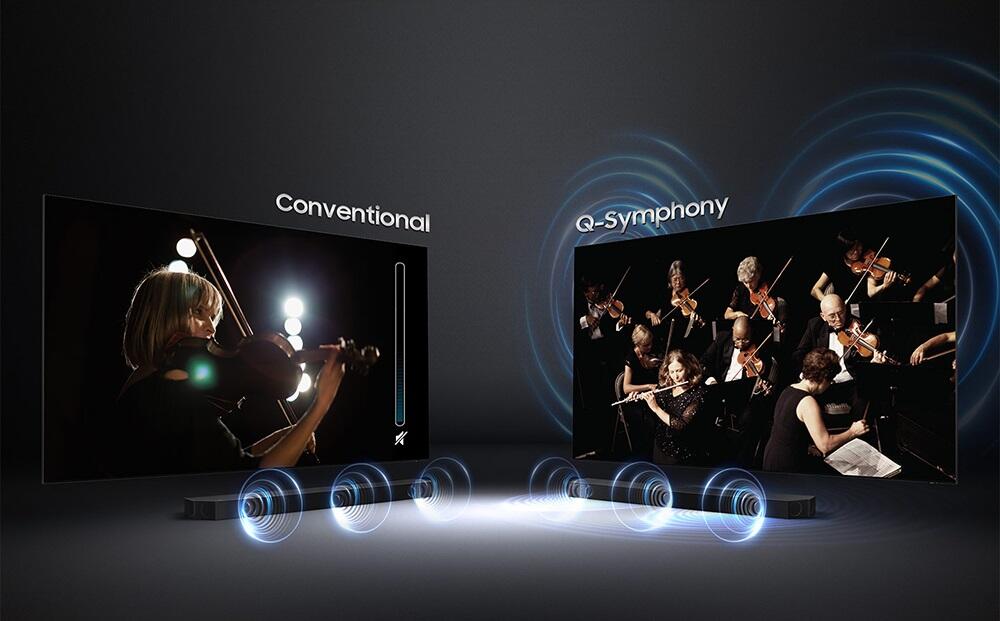 Funkcja dostępna jest w soundbarach Q-Serii czy modelach Ultra Slim, które to łącznie stanowią 73% udziału w sprzedaży soundbarów Samsung. Funkcja Q-Symphony jest kompatybilna z telewizorami Samsung, takimi jak Neo QLED 8K AI TV, Neo QLED 4K, OLED, QLED czy The Frame.