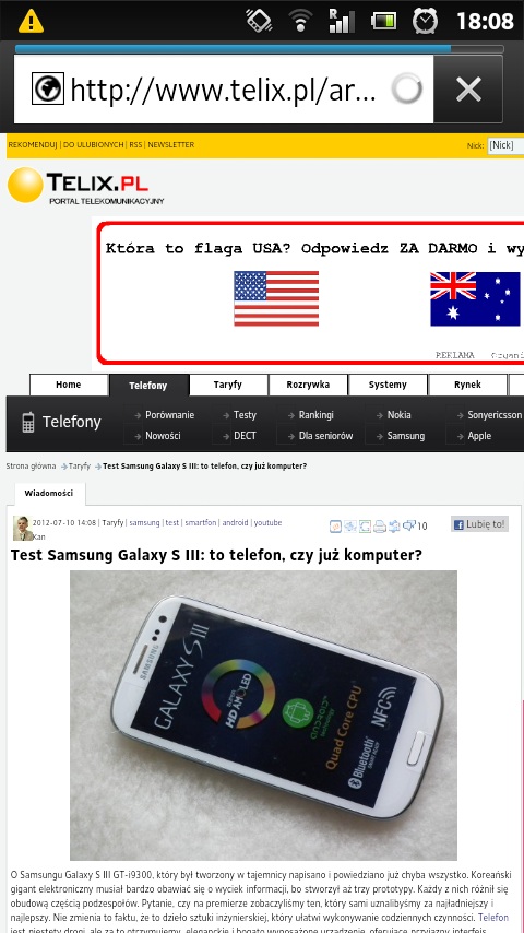 Smartfon jak wiadomo musi użytkownikom zapewnić wygodne korzystanie z zasobów sieci. Prosta przeglądarka, którą oferuje producent nie sprawia problemów w użytkowaniu (osobiście wolę Operę). Strony otwierają się dość płynnie i szybko. Oczywista oczywistość to obecność WIFI dzięki, któremu zmniejszamy koszty przeglądania Internetu. Niezastąpiona jest też technologia multitouch, z nią surfowanie jest po prostu przyjemniejsze – z łatwością nawigujemy po stronie i oddalamy czy przybliżamy wybrane treści charakterystycznie szczypiąc ekran. Telefon wspiera technologię flash.