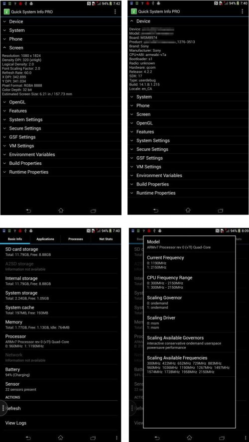 Ze zdjęć wynika, że Xperia wyposażona będzie w czterordzeniowy procesor Snapdragon 800 MSM8974 2.2Ghz wspomagany przez 2 GB pamięci operacyjnej.