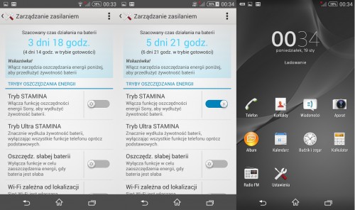Bateria w Z3 Compact to niewymienne ogniwo o pojemności 2600 mAh. Dzięki niezbyt dużemu ekranowi o nie najwyższej rozdzielczości oraz funkcji Stamina telefon jest liderem wielu zestawień badających czas pracy na jednym ładowaniu, a ja mogę tylko te wyniki potwierdzić. Osoby intensywnie korzystające z tego smartfona rozładują go po pełnych 2 dniach pracy, a przeciętni użytkownicy obędą się bez ładowarki przez dobre 3-4 dni. To świetny wynik na tle konkurencji i pewny kandydat dla osób poszukujących smartfona z wydajną baterią. Tryb Stamina wyłącza Wi-Fi, transmisję danych komórkowych oraz aplikacje po wyłączeniu ekranu a tryb Ultra Stamina sprawia, że wyświetlacz przybiera odcienie szarości i dostępne są jedynie podstawowe funkcje telefonu.