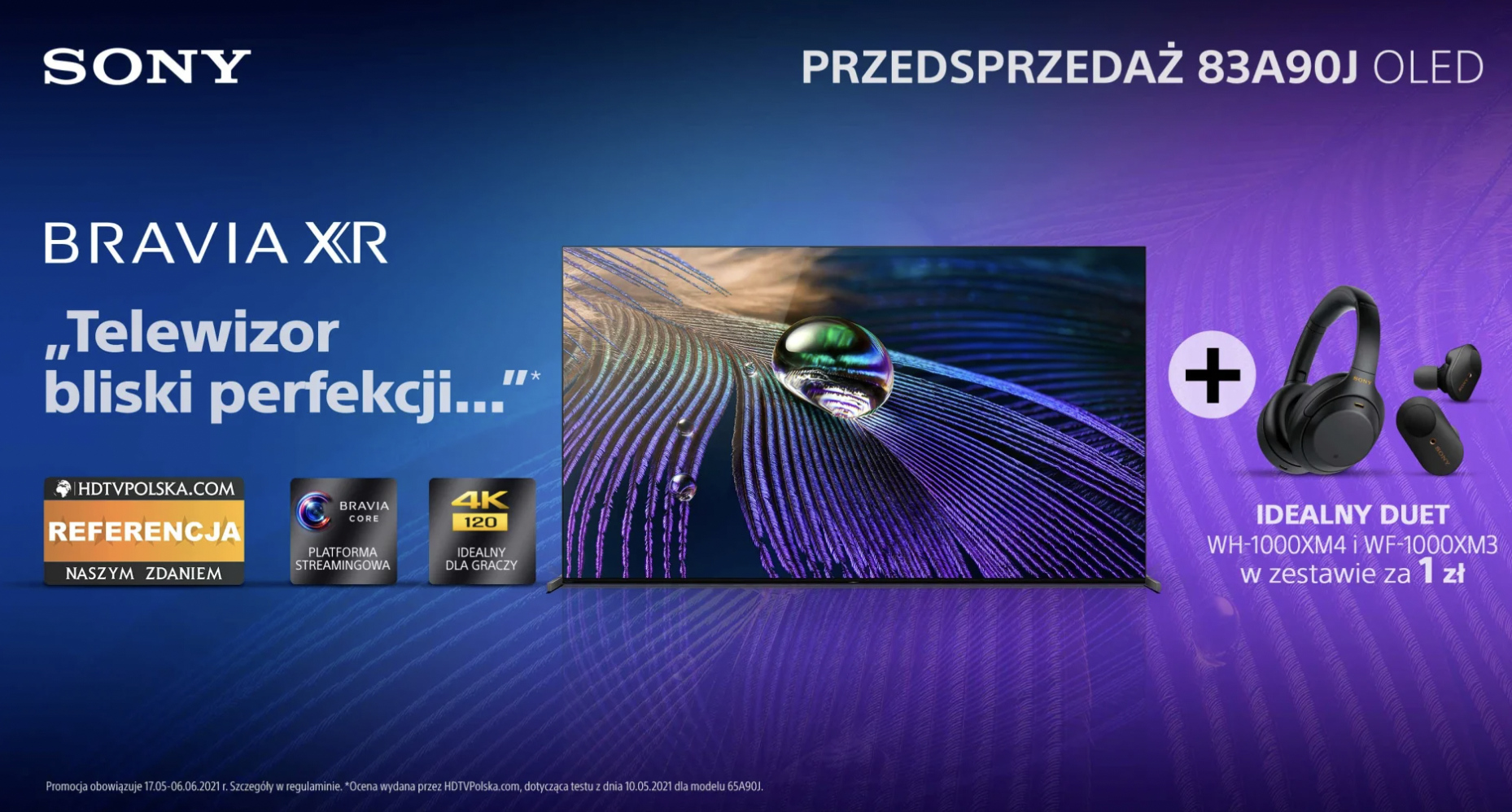 Przedsprzedaż telewizora OLED 4K HDR BRAVIA XR MASTER Series A90J 83″ w zestawie ze słuchawkami WH1000XM4 i WF1000XM3 rozpoczęła się i potrwa do 6 czerwca. Model ten można już zamawiać w sklepach Euro RTV AGD, Sony Centre, Media Markt i Media. Dalszych informacji należy szukać na lokalnej stronie internetowej Sony pod adresem sony.pl.