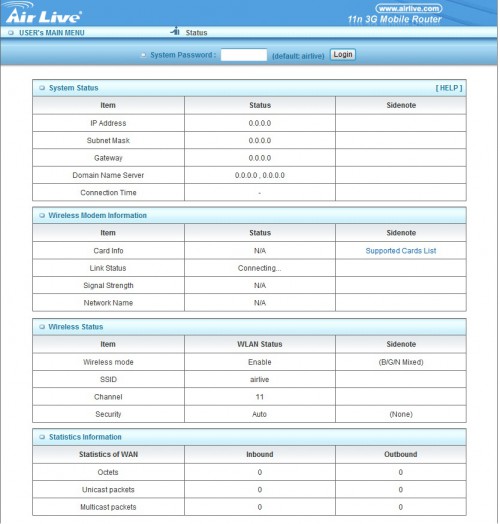 Podłączenie się do routera nie jest żadnym problemem do tego nie potrzeba instalować żadnego dodatkowego oprogramowania by móc pracować od razu po wyjęciu z pudełka – AirLive Traveler 3G posiada w swoim oprogramowaniu sterowniki obsługi wielu znanych modemów 3G USB. Po podłączeniu modemu USB (ja test robiłem na Option Icon 225) wszystko odbywa się automatycznie. Jest łatwo konfigurowalny za pomocą przeglądarki internetowej, posiada również możliwość zarządzania przez SNMP oraz UPnP. Po wpisaniu w przeglądarce adresu routera (192.168.1.1) pojawia się nam okno logowania.