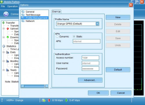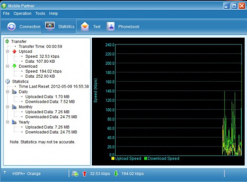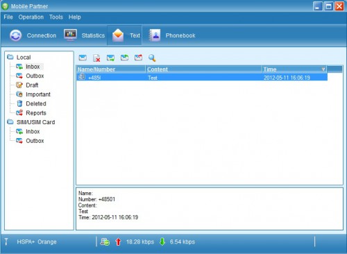 Program konfiguracyjny wyświetli nam informację o poziomie sygnału sieciowego i standardzie połączenia. Możemy też na bieżąco monitorować transfer danych. Sama aplikacja Mobile Partner poza dostępem do sieci oferuje również dodatkowe funkcje. Możemy ją np. wykorzystać do wygodnego wysyłania wiadomości SMS w oknie przypominającym znane programy pocztowe. Urządzenie może realizować wszystkie funkcje związane z przesyłaniem wiadomości tekstowych, jakie oferuje telefon komórkowy — wysyłanie, odbieranie, odpowiadanie, przekazywanie i usuwanie. Można również wyświetlać listę kontaktów zapisaną na karcie SIM. Menedżer kontaktów umożliwia także edycję, dodawanie, usuwanie oraz importowanie kontaktów.