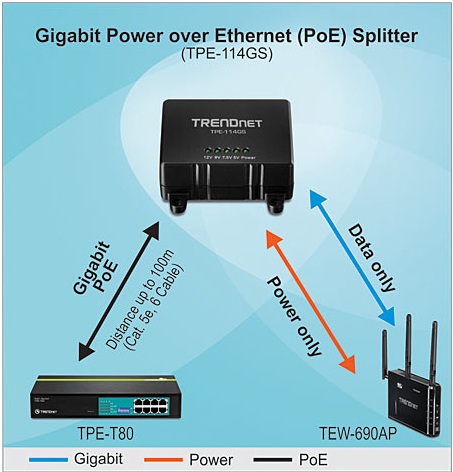 TRENDnet jako dostawca sprzętu sieciowego przedstawia proste rozwiązanie pozwalające na prostą integrację sieci wspierających PoE oraz tych które nie posiadają tej funkcjonalności. Wystarczy użyć urządzeń typu spliter lub injector firmy TRENDnet.