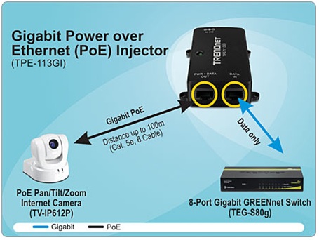 Iniektory posiadają dokładnie odwrotne zadanie, łączą one strumień danych i zasilania w jednym kablu Ethernet, dzięki czemu możliwe jest wykorzystanie starszej infrastruktury sieciowej dla nowych rozwiązań PoE. Poniżej schemat działania iniektora marki TRENDnet, modelu TPE-113GI.