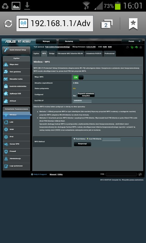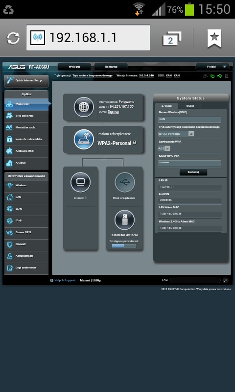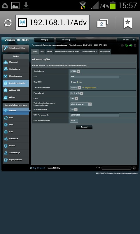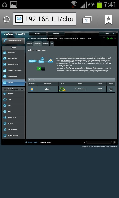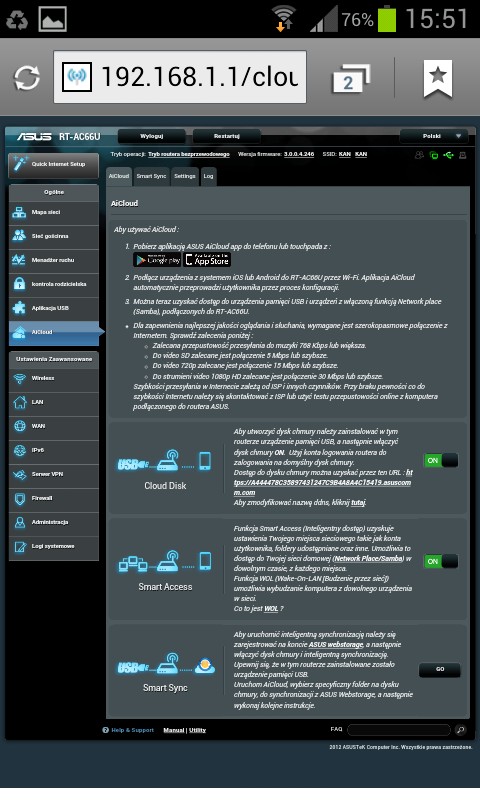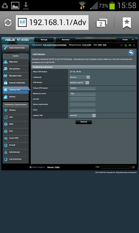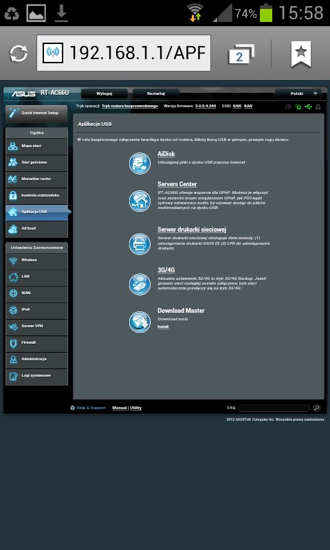 Używam od około 2 miesięcy. Wszystko działa ładnie, pięknie, ale… GUI się ślimaczy. Podłączyłem przez USB dysk SSD – zasoby samba potrafią czasem „zniknąć”. Router trzeba restartować. Podłączyłem do drugiego USB modem 3G jako zapasowe łącze – czasem działa, czasem przez dłuższy czas łącze modemowe jest „disconnected” (powinno być „standby”). Po odłączeniu głównego łącza (WAN) router przełącza się na zapasowe, ale po ponownym podłączeniu głównego nie wraca na nie. Przynajmniej tak mi się wydaje że tak to powinno działać, skoro ustawiamy priorytet, które łącze jest główne, a które zapasowe. Próbowałem też firmware’u AsusWRT-by Merlin, ale to nic nie zmieniło w działaniu dual wan. Pewnie jeszcze jakieś bugi po dłuższym użytkowaniu ujrzą światło dzienne. Ogólnie sprzęcik bardzo, bardzo fajny, ogrom funkcjonalności (w AsusWRT- by Merlin można, co mnie bardzo cieszy, uruchomić po dwie instancje serwera i klienta OpenVPN), ale soft wymaga moim zdaniem dopieszczenia.
