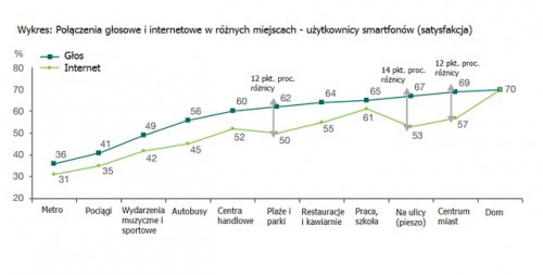 Najniższy poziom satysfakcji z usług mobilnych we wszystkich miastach obserwowany jest w komunikacji miejskiej. Tylko 36% osób jest zadowolonych z połączeń głosowych i 31% z internetu mobilnego. Zdaniem badanych połączenia głosowe działają generalnie lepiej w autobusach i pociągach niż w metrze. Najwyższy poziom niezadowolenia (50-60%) jest wśród użytkowników metra w Mexico City, Tokyo, Londynie, Nowym Jorku i Paryżu.